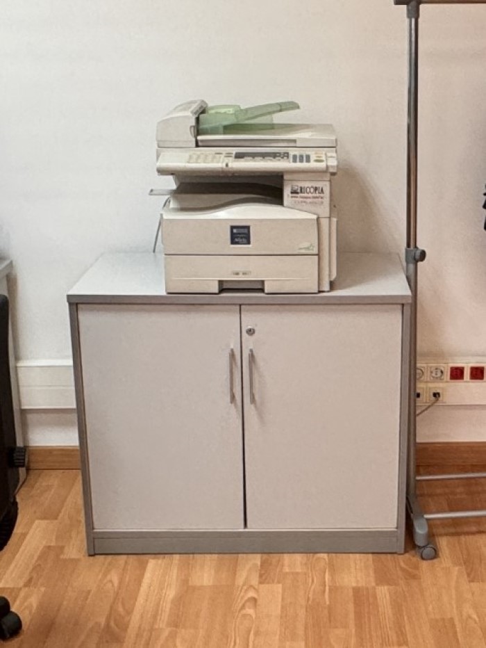 Armario bajo de melamina gris con puertas y cerradura. 1 balda regulable.