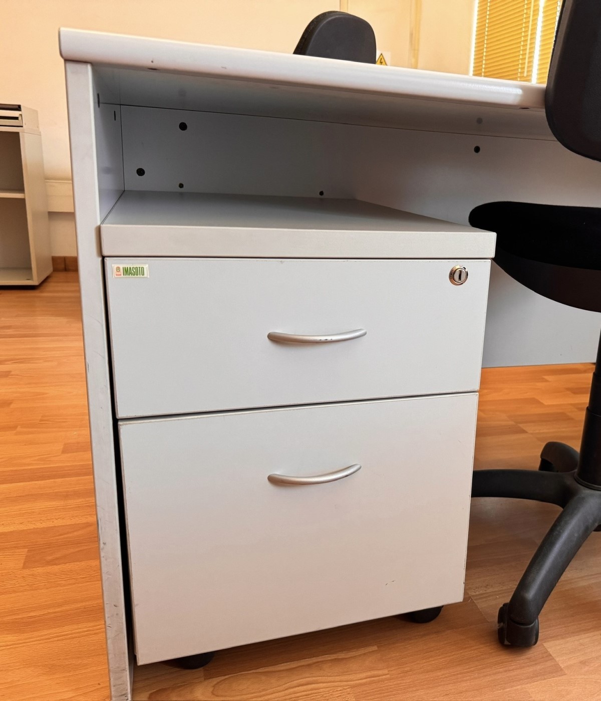 Lote de 3 cajoneras de oficina 1 cajón + 1 cajón carpetero para carpetas colgantes. Melamina gris de alta calidad. Con ruedas. Como nuevas.