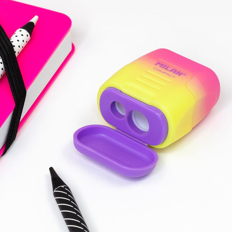 Sacapuntas doble (uno estándar y otro MAXI) con depósito. Diseño COMPACT, edición Sunset. El sacapuntas dispone de una cuchilla de acero afilada y resistente, ideal para todo tipo de lápices. Sacapuntas con cuchillade seguridad: este sistema evita quurpueda separar la hoja del cuerpo del sacapuntas. 4 colores surtidos: amarillo, rosa, lila y turquesa. Diseño original creado por el departamento de I+D de MILAN.